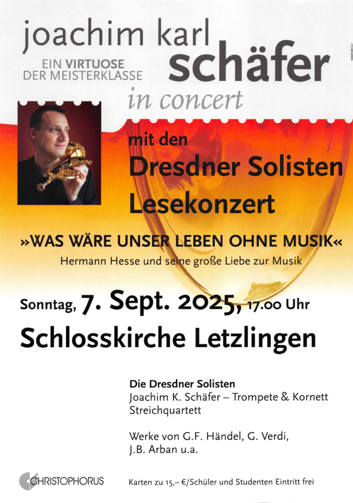 „The trumpet shall sound – Trompetenklänge“ – Konzert für 3 Trompeten, Pauken und Orgel mit dem Trompetenensemble der „Dresdner Bach-Solisten“ – Es erklingen Werke von G. F. Händel, G. Romanino und Heinrich v. Biber u.a., Ausführende: Ayumi Kitamura – Orgel; Joachim K. Schäfer, Arne Lagemann, Kiichi Yotsumoto – Trompeten, Frank Hiesler – Pauken, Karten zu 10,00 € an der Tageskasse, Schüler und Studenten frei